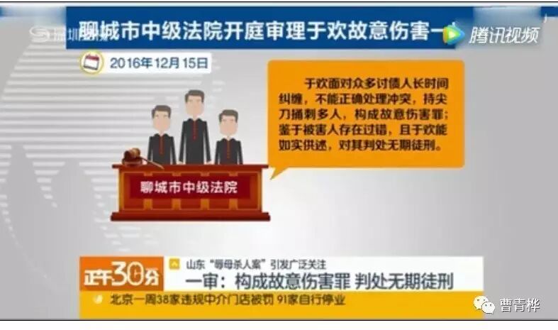 于欢杀人案已不仅是举国关注,全世界的华人都在关注。以微信为主的社交平台充满了关于此案的各种信息。苦于一直没有一个比较权威性的事实报道,很难对此案作出评价。今天看了深圳卫视的报道,有根有据,所述事实应该比较客观和准确。据深圳卫视报道,2016年4月,22岁的山东人氏于欢,其母借了高利贷,虽已将本金和大部分高利还清,放债者还是派人来讨余债。讨债人员将母子二人及一名雇员困于室内,除限制他们人身自由外,还百般侮辱于母(包括用下流语言辱骂于母、往其胸部弹烟灰以及脱下裤子对她做下流猥亵的动作等),情节之恶劣令人发指。警察接到报警赶来后并未救母子与水火、将讨债人捉拿归案,而只说了句“要账可以,但不能动手打人”便扬长而去,一任讨债人员继续作恶。于欢无助之下,欲夺路而逃,被讨债人员拦阻。混乱之中,于欢摸到桌上的水果刀刺向讨债人,造成一死、二重伤一轻伤。2016年12月,山东聊城中级人民法院以故意伤害罪判处于欢无期徒刑。