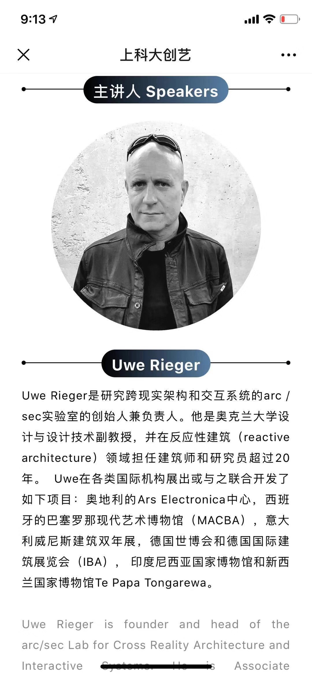 日前新西兰的奥克兰大学助理教授Uwe Rieger来上海科技大学创艺学院讲学,来办公室看我。我陪他参观了学校。他是一个重要的交互设计与建筑结合的人物,多次参加奥地利林兹的国际交换设计大展,他的专业范围叫做交互建筑(reactive architecture),是在德国发展起来的边缘学科,他在我们学院做工作坊,和他交谈,有很多设计理念是一致的,希望推动合作和发展。