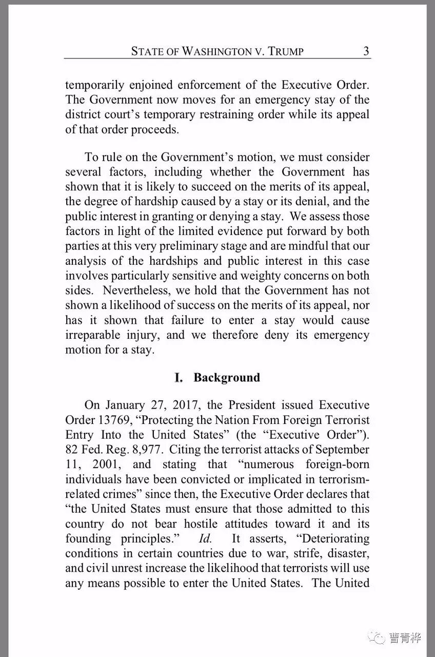 概括而言,上诉法院的决定基于联邦政府不能证明自己的事实和法理在上诉中胜诉大于败诉的可能性(a likelihood of success on the merits of its appeal),又不能证明如果上诉法院不恢复入境禁令,联邦政府会蒙受无法挽回的损失( irreparable injury)。(以上概述见2017年2月9日第九区上诉法院关于此案的法律意见书第2到3页。)