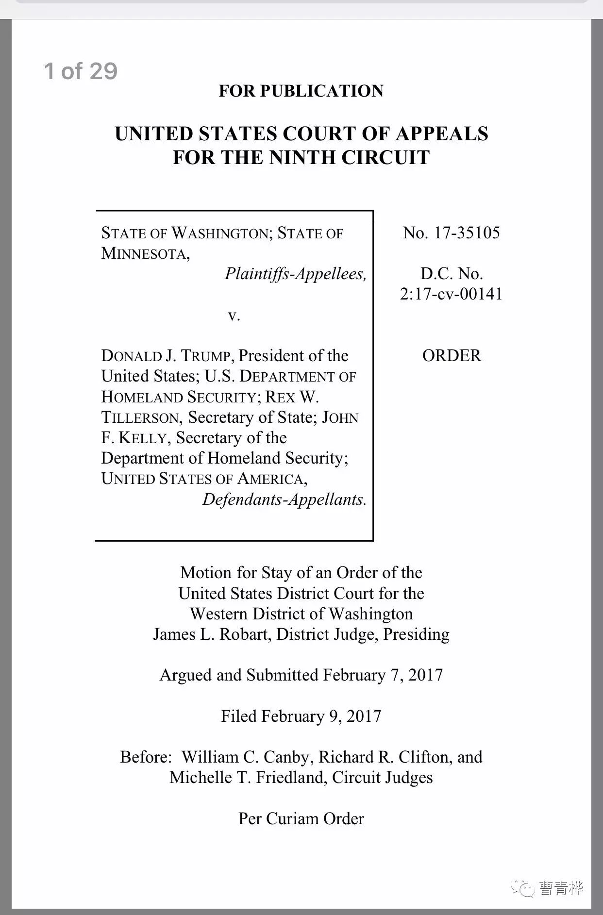 2月3日,华盛顿西区联邦法院批准了华盛顿州的紧急动议,在全国范围内冻结(即暂时解除)了联邦政府的临时入境禁令。