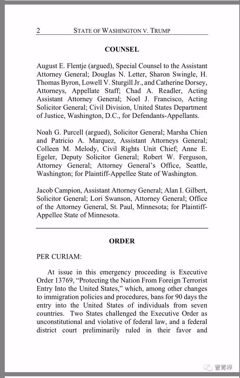 权力的制约,不免受到法官(或者议员,如果是国会制约政府的情形)的价值观和政治理念的影响,但是他们的决定绝不是武断的。就拿今天第九上诉区法院的决定来说,三个法官的决定是基于一系列的法律逻辑分析作出的,他们的书面意见论述了以下几个方面: