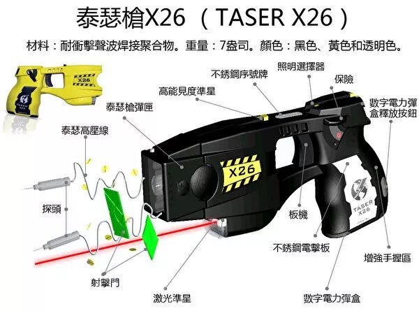 泰瑟枪的最大射程为7米,“飞镖”的速度为每秒60米。它可以隔着5厘米厚的衣服放电,并在5秒钟内多次放电,每次持续时间为百万分之一秒。