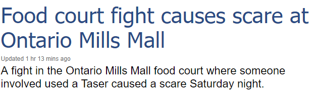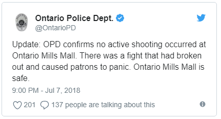 目前,事件已经平息,有购物的人在逃跑过程中受到轻伤。根据Ontario警察局的Twitter,十个门奥特莱斯目前已经安全了!而现在也没有任何人被逮捕。